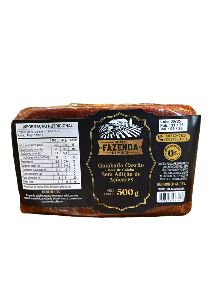 Goiabada tradicional em versão diet, com textura macia, sabor intenso da fruta e sem adição de açúcar. Ideal para quem busca equilíbrio entre prazer e cuidado, perfeita para consumo puro, com queijos ou em receitas.